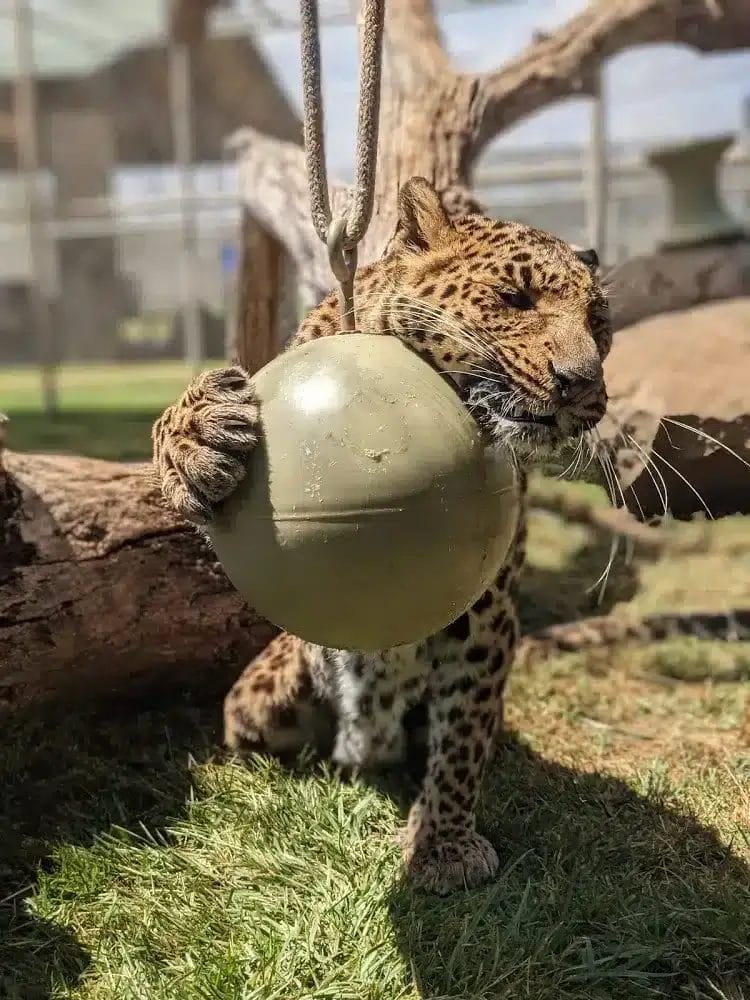 With the help of a generous donor couple, Conga’s Run—a special aerial skyway—was added to her habitat. This unique structure allows Conga to enjoy a bird’s-eye view of the sanctuary, replicating the high perches leopards prefer in the wild.